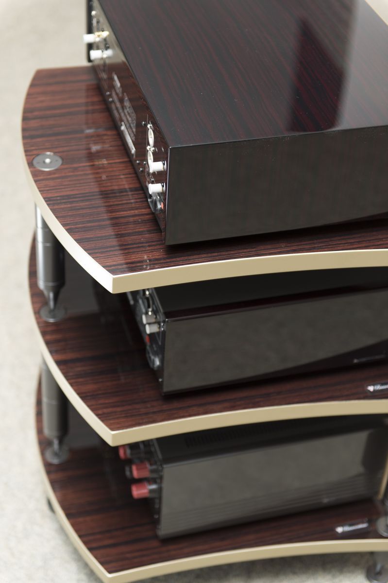 Durch die schlichten goldenen Leisten und die glänzenden Holzebenen eignet es sich ideal um Ihre Accuphase Anlage in Szene zu setzen.